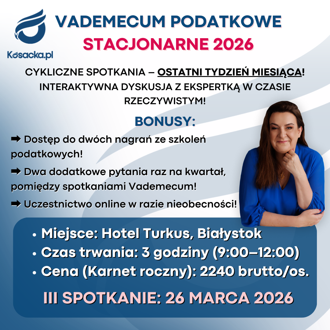 Vademecum Podatkowe Stacjonarne 2026 W odpowiedzi na Państwa oczekiwania, rozszerzyliśmy naszą ofertę o Vademecum Podatkowe Stacjonarne! To doskonała okazja, aby regularnie aktualizować swoją wiedzę i na bieżąco omawiać zmiany podatkowe na rok 2026 pod okiem uznanej ekspertki Doroty Kosackiej. Cykliczne Spotkania – Ostatni Tydzień Miesiąca! Miejsce: Hotel Turkus – Al. Jan Pawła II 54 ,...Read More