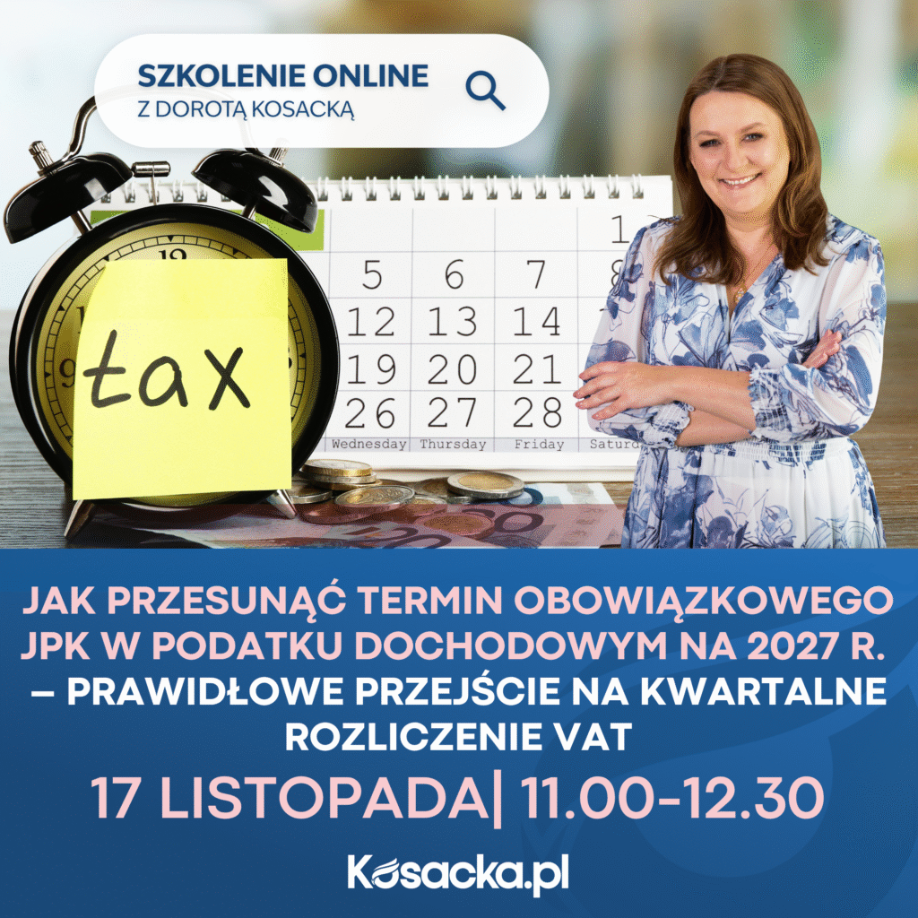 Celem szkolenia jest pokazanie, jak legalnie i skutecznie przesunąć obowiązek składania JPK w podatku dochodowym z 2026 r. na 2027 r., poprzez prawidłowe przejście na kwartalne rozliczenie VAT.